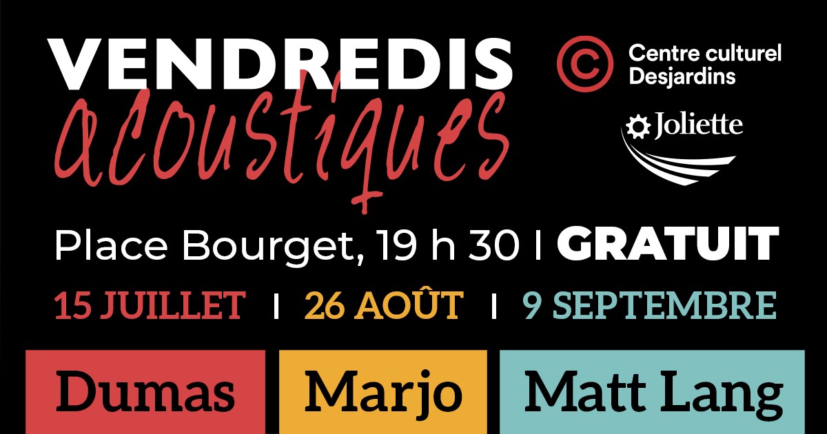 La Ville de Joliette en collaboration avec le Centre culturel Desjardins présentera une série de trois rendez-vous musicaux en soirée, gratuits et sans inscription à la place Bourget.